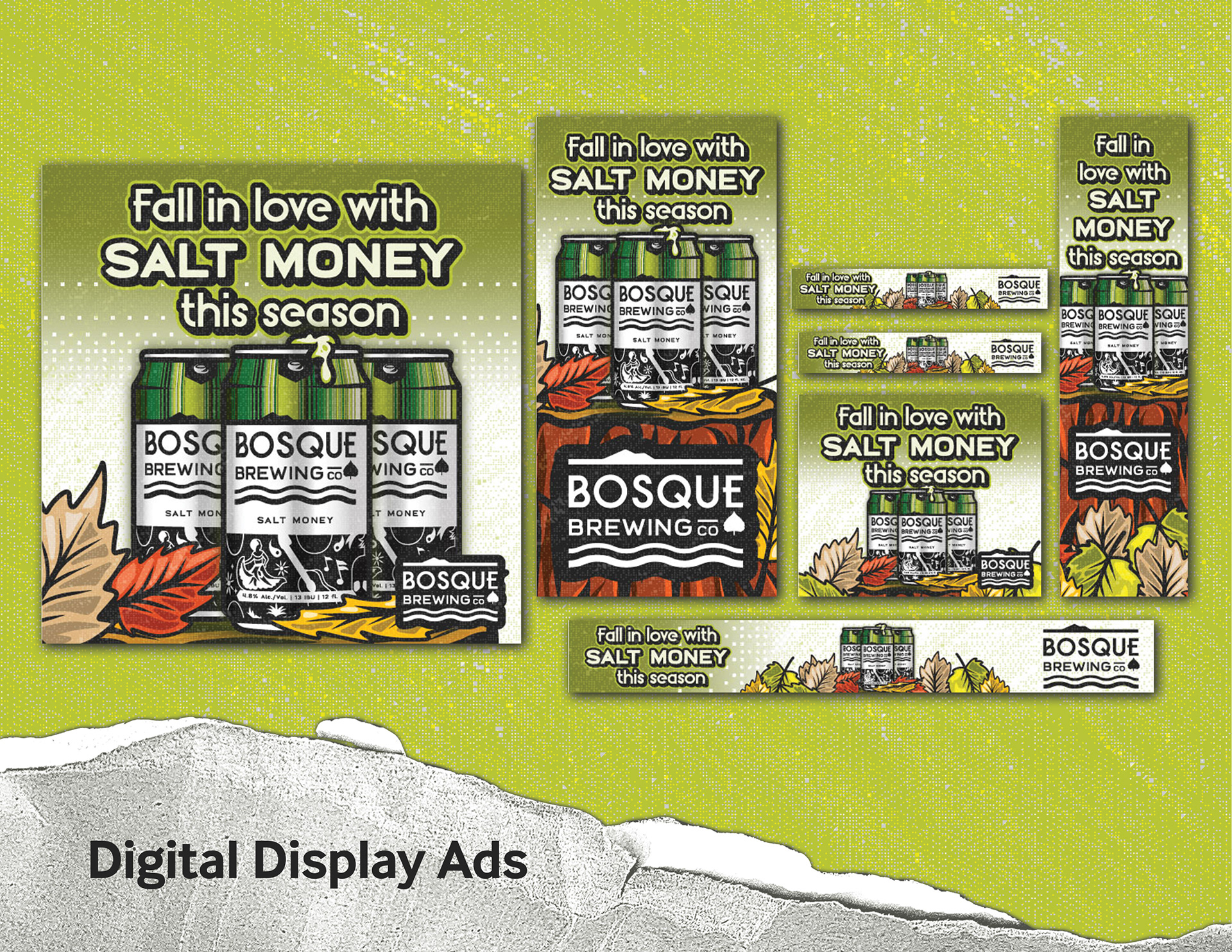 My goal was to illustrate a cool image that encapsulated the autumn vibes such as the colors and textures you see on the hiking trails around the Rio Grande or up in the Sandia Mountains. I also wanted the composition to have texture overlayed each part of the campaign to help bring a rooted, rustic, burlap sack, earth feeling to it all as well. My reason for this was because I think of enjoying time with loved ones, friends and family picking sunflowers, exploring pumpkin patches, or navigating a corn maze amongst all other enjoyable fall activities. With all of that said, I focused on bringing this ad campaign to life with unique imagery that captivated the warm spirit and engagement Bosque would seek to have resonate with their customers and bring them inside to warm up drinking some Salt Money this cool and crisp fall season.